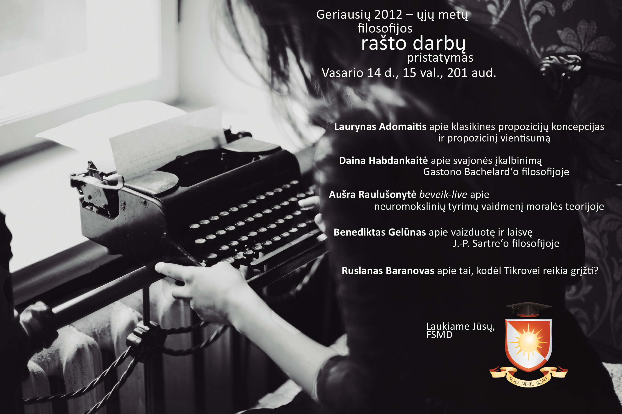 Vilniaus universiteto Filosofijos studentų mokslinė draugija (FSMD) kviečia visus besidominčius filosofija į geriausių 2012 metų filosofijos rašto darbų almanacho pristatymą. Renginio metu pranešėjai kalbės apie savo darbų temas bei problemas, organizatoriai aptars šios iniciatyvos idėją, jos genezę bei ateitį.